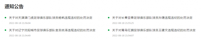 18日晚,中國足協(xié)網(wǎng)站發(fā)布4則球員、俱樂部官員違規(guī)違紀(jì)的處罰決定,中超天津津門虎球員楊帆、中超長春亞泰球員孫捷及中乙青島紅獅球員王建文均停賽5場,中甲遼寧沈陽城市足球俱樂部官員林濤6場比賽禁止進(jìn)入體育場。處罰決定全文如下: