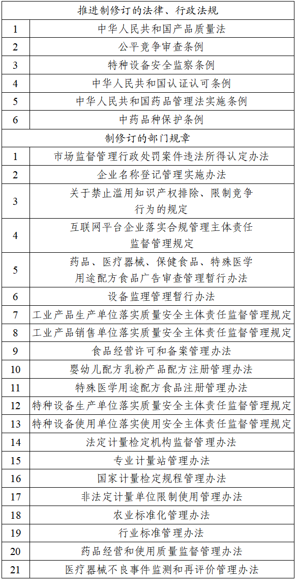 重點圍繞四個方面作出部署:一是深入實施公平競爭政策,不斷優(yōu)化公平競爭環(huán)境,積極推動《公平競爭審查條例》的制定,修訂《關于禁止濫用知識產權排除、限制競爭行為的規(guī)定》等規(guī)章。二是持續(xù)推進市場準入準營退出便利化,不斷優(yōu)化營商環(huán)境,切實提升平臺經濟常態(tài)化監(jiān)管水平,制修訂《企業(yè)名稱登記管理實施辦法》《互聯網平臺企業(yè)落實合規(guī)管理主體責任監(jiān)督管理規(guī)定》《藥品、醫(yī)療器械、保健食品、特殊醫(yī)學用途配方食品廣告審查管理暫行辦法》等規(guī)章。三是嚴格落實“三品一特”安全責任,進一步強化市場監(jiān)管領域安全保障,積極推動《特種設備安全監(jiān)察條例》《藥品管理法實施條例》《中藥品種保護條例》等行政法規(guī)的修訂,制修訂《食品經營許可和備案管理辦法》《設備監(jiān)理管理暫行辦法》《特種設備生產單位落實質量安全主體責任監(jiān)督管理規(guī)定》《藥品經營和使用質量監(jiān)督管理辦法》等規(guī)章。四是充分發(fā)揮質量支撐作用,加快推進質量強國建設,積極推動《產品質量法》《認證認可條例》的修訂,修訂《國家計量檢定規(guī)程管理辦法》《行業(yè)標準管理辦法》等規(guī)章。