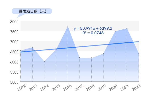 數(shù)據(jù)統(tǒng)計(jì)顯示,2012年至2022年,我國暴雨站日數(shù)有明顯的增加趨勢。這意味著,2012年到2022年,我國暴雨天氣過程的持續(xù)時間或影響范圍有增加(擴(kuò)大)的趨勢。