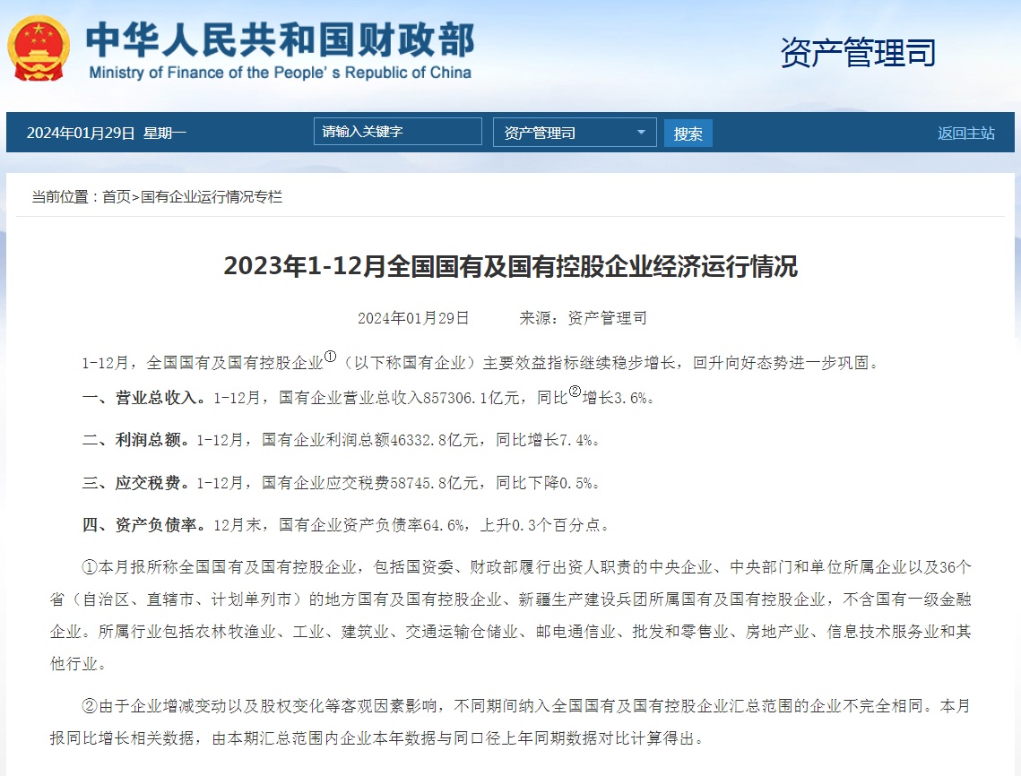 1月29日,財政部在其官方網(wǎng)站公布2023年1-12月全國國有及國有控股企業(yè)經(jīng)濟運行情況。