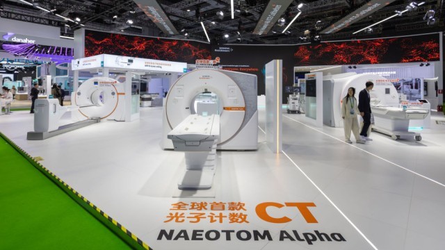 2023年11月8日在第六屆中國(guó)國(guó)際進(jìn)口博覽會(huì)醫(yī)療器械及醫(yī)藥保健展區(qū)拍攝的西門(mén)子展位。新華社記者 王翔 攝