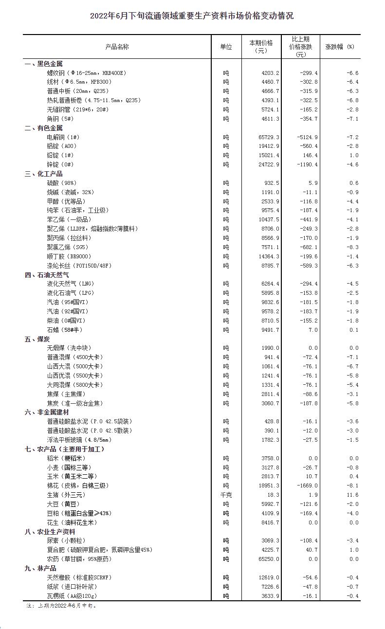 中新網(wǎng)7月4日電 國家統(tǒng)計(jì)局網(wǎng)站4日公布2022年6月下旬流通領(lǐng)域重要生產(chǎn)資料市場價格變動情況。據(jù)對全國流通領(lǐng)域9大類50種重要生產(chǎn)資料市場價格的監(jiān)測顯示,2022年6月下旬與6月中旬相比,6種產(chǎn)品價格上漲,40種下降,4種持平。其中,生豬(外三元)價格報18.3元/千克,環(huán)比上漲11.6%。(中新財經(jīng))