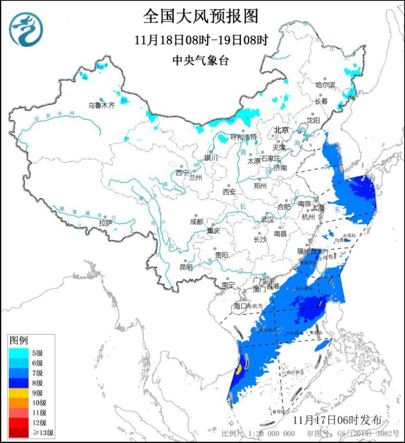 11月17日08時至18日08時,內蒙古中東部、東北大部、河北北部、山東半島東部等地將有5~6級、陣風7~8級的大風;渤海、渤海海峽、黃海大部海域、東海大部海域、臺灣海峽、臺灣以東洋面、巴士海峽、南海大部海域將有7~8級、陣風9~10級的大風。11月18日08時至19日08時,內蒙古中東部、黑龍江東部、吉林東部等地將有5~6級、陣風7~8級的大風;黃海東部海域、東海東北部海域、臺灣海峽、臺灣以東洋面偏南海域、巴士海峽、南海大部海域將有7~8級、陣風9~10級的大風。中央氣象臺11月17日06時繼續(xù)發(fā)布大風藍色預警。