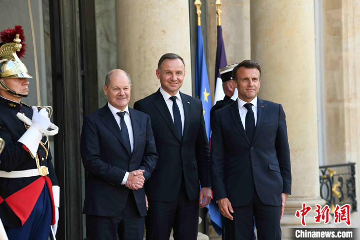 當(dāng)?shù)貢r(shí)間6月12日晚,法國(guó)總統(tǒng)馬克龍?jiān)诎屠钀埯惿釋m與德國(guó)總理朔爾茨、波蘭總統(tǒng)杜達(dá)會(huì)面。他們共同出席“魏瑪三角”機(jī)制下的三國(guó)領(lǐng)導(dǎo)人會(huì)議。 中新社記者 李洋 攝