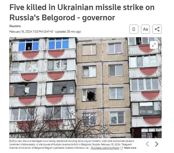 中新網(wǎng)2月15日電 據(jù)路透社報道,俄羅斯官員稱,當?shù)貢r間15日,烏克蘭導彈襲擊俄羅斯別爾哥羅德州,造成5人死亡,其中包括一名兒童。