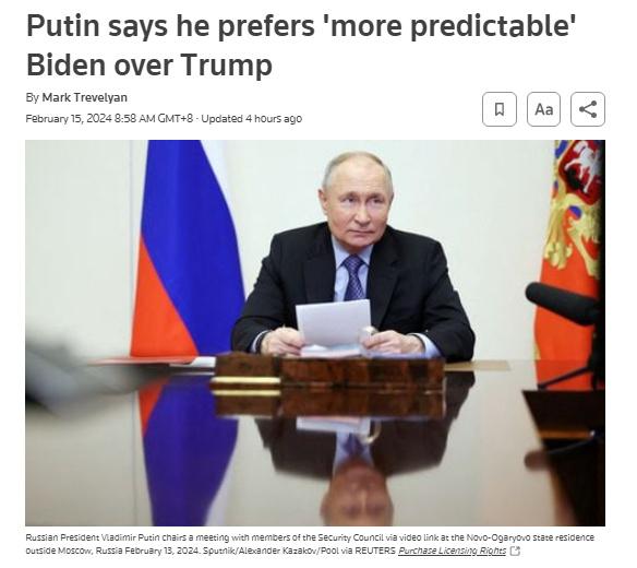 據(jù)報道,這是普京首次公開評論2024年美國大選。當(dāng)被問及兩人誰當(dāng)選對俄羅斯“更有利”時,普京回應(yīng):“拜登,他更有經(jīng)驗、更有預(yù)見性,是一位老派政治家?!?/p>