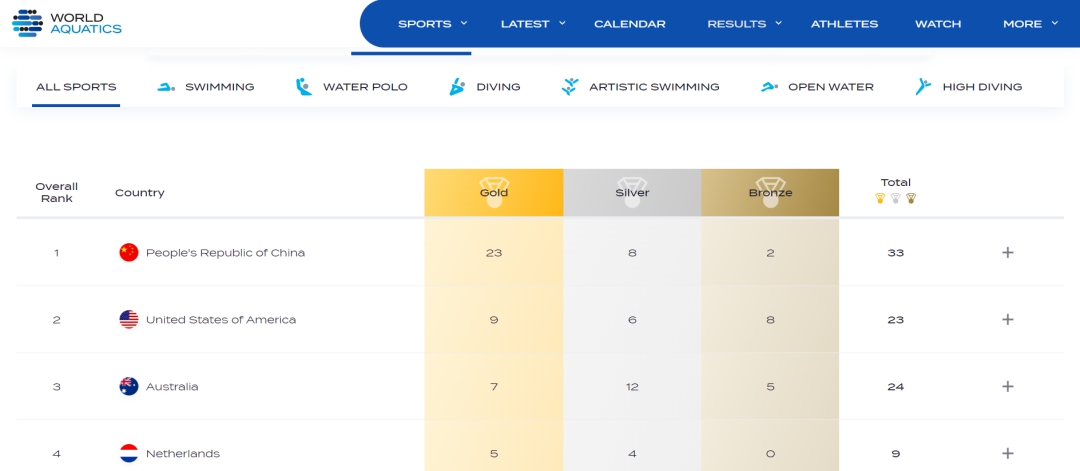 圖為獎(jiǎng)牌榜。圖片來(lái)源:世界泳聯(lián)網(wǎng)站截圖