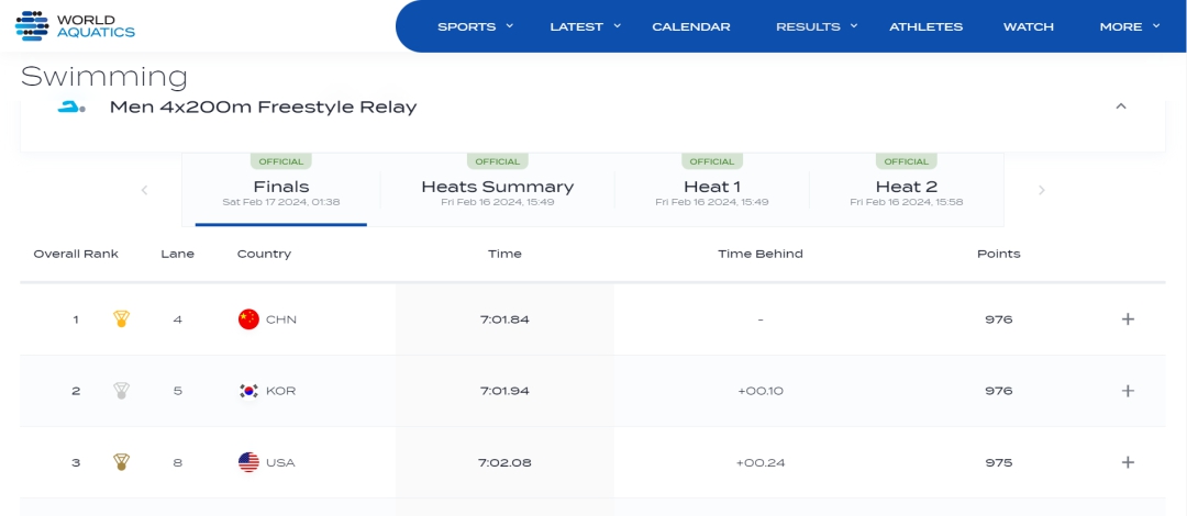 圖為男子4X200米自由泳接力決賽中國(guó)隊(duì)成績(jī)。圖片來(lái)源:世界泳聯(lián)網(wǎng)站截圖