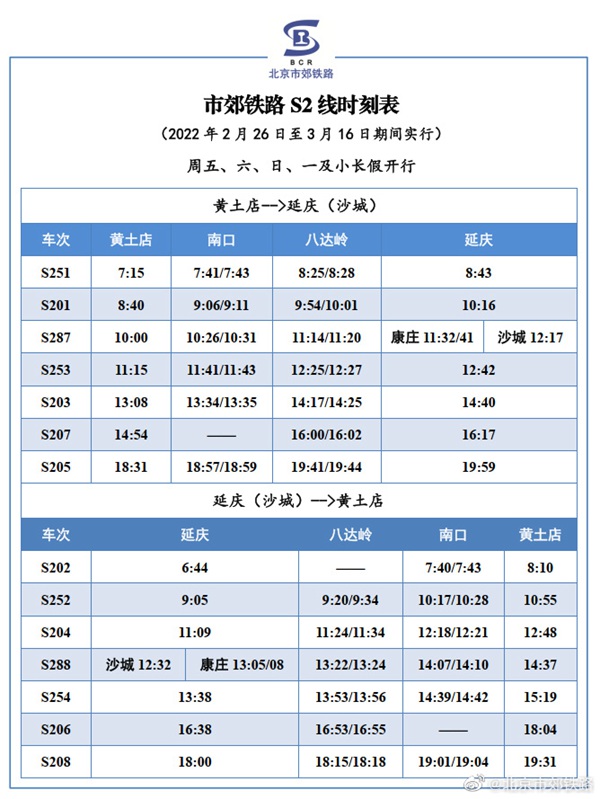 人民網(wǎng)北京2月25日電 據(jù)北京市郊鐵路官方微博消息,根據(jù)鐵路運輸調(diào)整通知,2022年2月26日至3月16日, S2線恢復周二、三、四3對/日,周五、六、日、一及小長假7對/日的列車開行方案,列車開行時點無變化,具體列車時刻表如下所示。