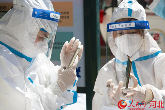 河間市的志愿者身穿紅馬甲在防控一線提供志愿服務(wù)。 李世文攝