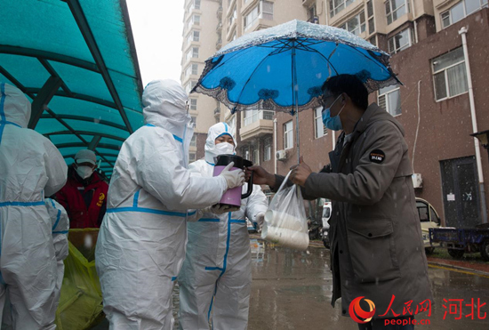 “辛苦了!喝點(diǎn)熱水吧!”滄州當(dāng)?shù)鼐用駷檠┨炖飯?jiān)守的抗疫白衣工作者送去暖心的熱水。 牛建才攝