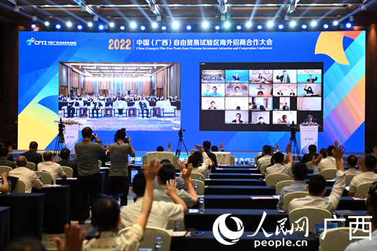 人民網(wǎng)南寧5月27日電 (記者彭遠(yuǎn)賀)5月27日下午,2022中國(廣西)自由貿(mào)易試驗區(qū)海外招商合作大會在南寧舉行。大會以“自貿(mào)聯(lián)動世界,合作共繪藍(lán)圖”為主題,采用線上、線下結(jié)合方式,在北京和南寧同步設(shè)置主會場,在新加坡、馬來西亞、日本、韓國、德國、美國等國家或地區(qū)設(shè)置分會場,向全球展現(xiàn)廣西自貿(mào)試驗區(qū)經(jīng)濟活力、創(chuàng)新動力和投資潛力,吸引全球優(yōu)質(zhì)資源匯聚,共商共享合作機遇,共譜合作新篇章。