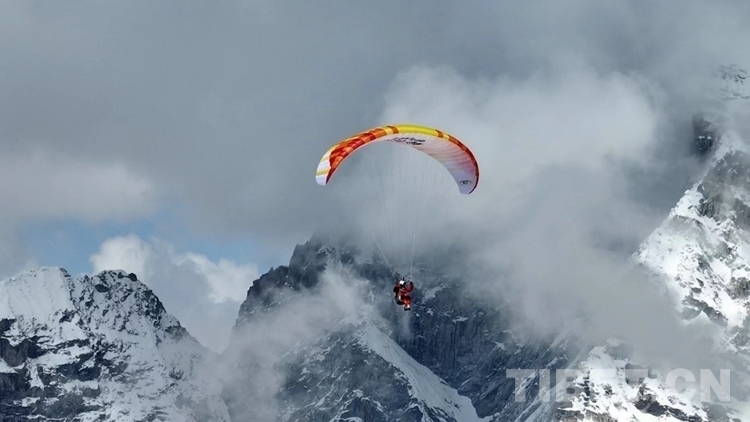 圖為李生濤成功從珠穆朗瑪峰海拔8000米處用無動(dòng)力單人滑翔傘起飛 活動(dòng)主辦方供圖