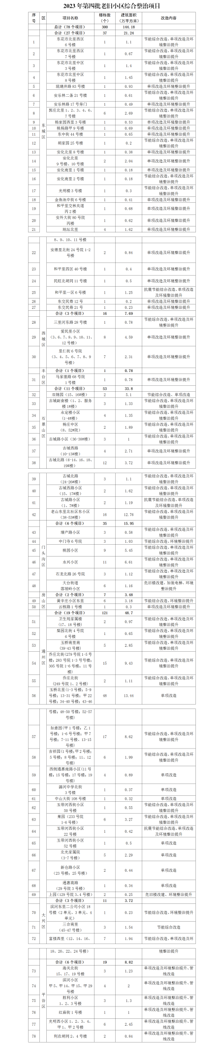 央廣網(wǎng)北京12月22日消息(記者門庭婷)12月22日,北京市住房城鄉(xiāng)建設委公布了2023年第四批老舊小區(qū)綜合整治項目名單,共有78個項目納入改造計劃,涉及改造樓棟數(shù)300棟,2萬戶,改造建筑面積144萬平方米。