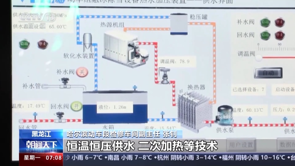 哈爾濱動(dòng)車段檢修車間副主任 張釗:設(shè)備的迭代主要體現(xiàn)在集中適時(shí)加熱、恒溫恒壓供水、二次加熱等技術(shù),能夠滿足整列動(dòng)車組清冰除雪需求。