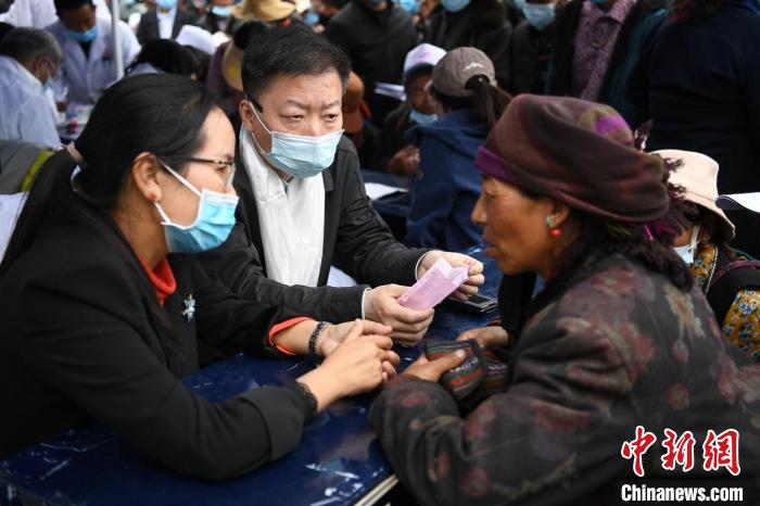 上海新華醫(yī)院副院長潘曙明教授在薩迦縣義診現(xiàn)場為藏族民眾診病?!O國根 攝