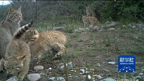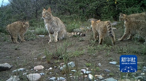 這是布設(shè)在祁連山國家公園青海片區(qū)的紅外相機(jī)拍攝到的5只荒漠貓同框畫面(2020年7月3日攝)。新華社發(fā)(祁連山國家公園青海省管理局供圖)