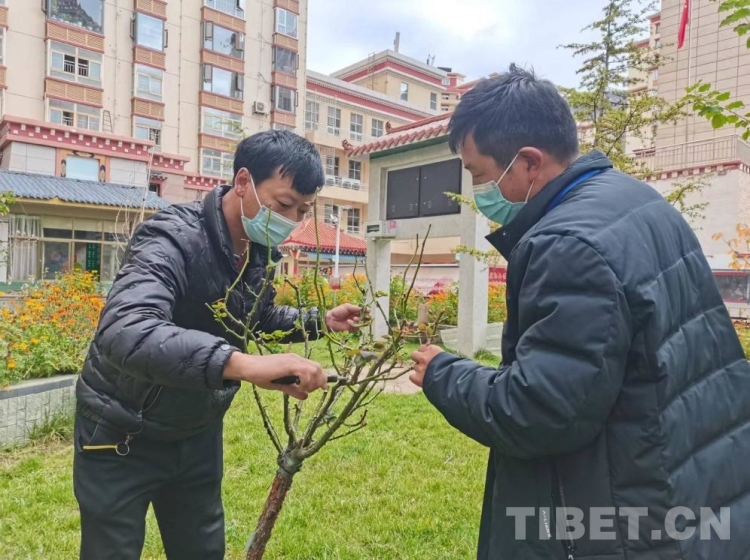 土登丁增(右)教授物業(yè)工作人員修剪樹枝