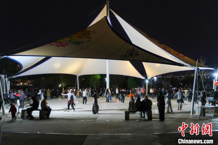 4月26日晚,在拉薩柳梧中心公園跳鍋莊舞的市民,現(xiàn)場熱鬧非常。 中新社記者 江飛波 攝