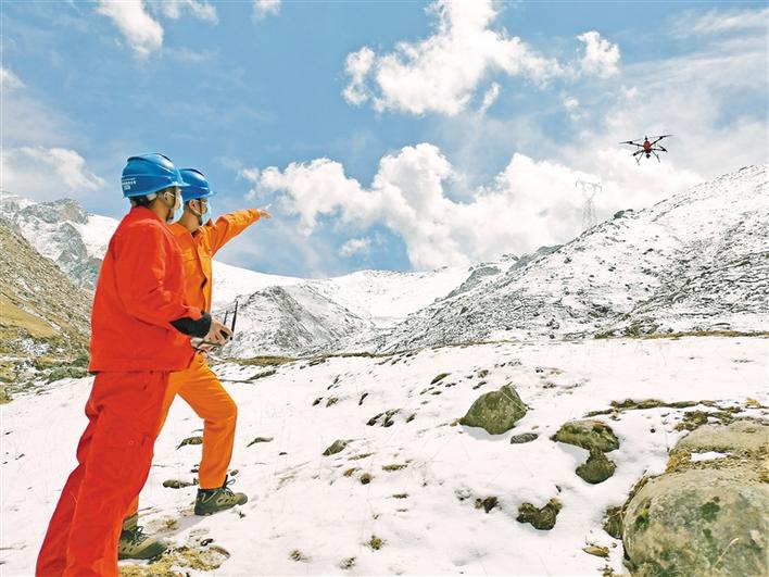 圖為國(guó)網(wǎng)西藏電力有限公司檢修公司兩名員工用無(wú)人機(jī)巡視220千伏墨山線。 王嘯天 記者 拉巴桑姆 攝