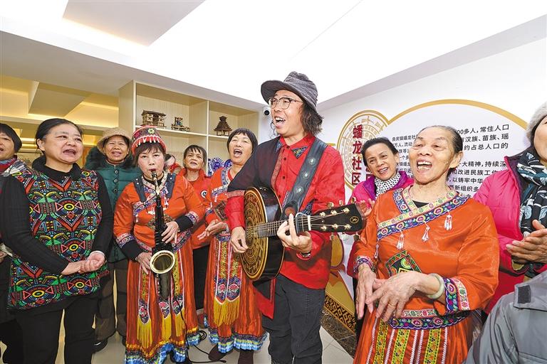 “蟠龍社區(qū)生活著漢族、壯族、瑤族等15個(gè)民族的同胞,少數(shù)民族人口約占社區(qū)總?cè)丝诘?/3。”蟠龍社區(qū)黨委副書(shū)記許玉君介紹說(shuō),社區(qū)結(jié)合多民族“嵌入式”居住的特點(diǎn),創(chuàng)新踐行“136”工作機(jī)制,即圍繞鑄牢中華民族共同體意識(shí)這條主線,通過(guò)加強(qiáng)黨的領(lǐng)導(dǎo)、織牢精神紐帶、用好治理平臺(tái)“三個(gè)抓手”,積極創(chuàng)造各民族共居共學(xué)、共建共享、共事共樂(lè)的“六共”條件,讓各族群眾像石榴籽一樣緊緊抱在一起。“我是漢族,會(huì)做壯族的特色菜,我愛(ài)人是仫佬族,漢字書(shū)法練得有模有樣?!斌待埳鐓^(qū)藝術(shù)團(tuán)骨干何繼榮老人說(shuō)。