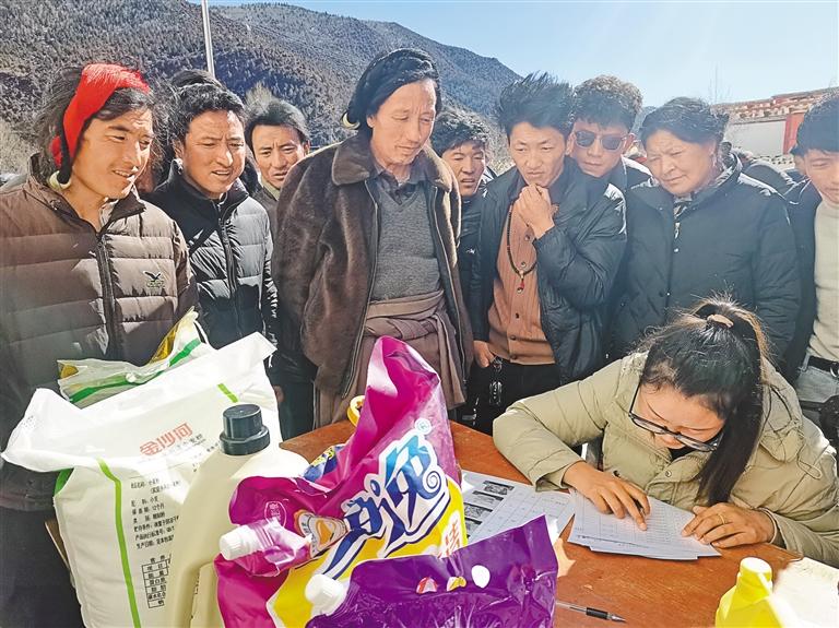 圖為芒康縣幫達(dá)鄉(xiāng)毛尼村群眾用積分兌換生活物資現(xiàn)場(chǎng)。記者 周婷婷 攝