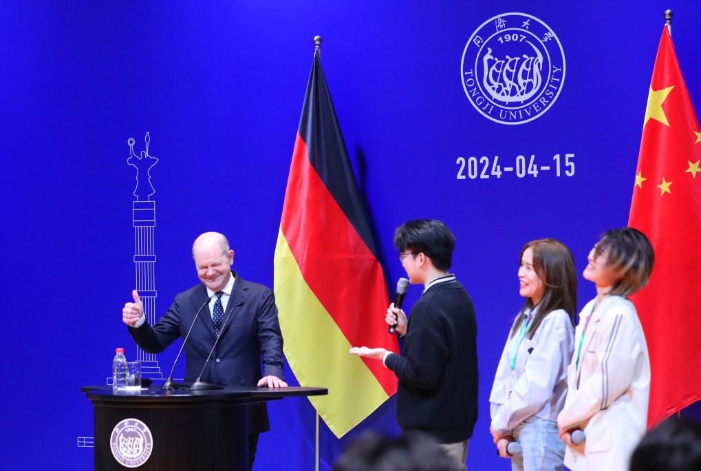 4月15日,德國總理朔爾茨(左)在同濟大學嘉定校區(qū)與學生進行交流。新華社記者方喆 攝