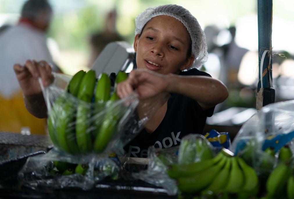 6月5日,在洪都拉斯圣佩德羅蘇拉,一名當(dāng)?shù)貑T工在納納香蕉公司工作。新華社發(fā)(戴維·德拉帕斯攝)