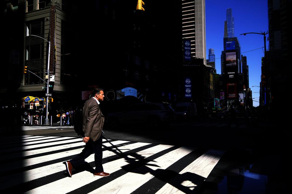 10月1日,在美國紐約曼哈頓的時報(bào)廣場附近,行人通過人行橫道斑馬線過馬路。新華社記者吳曉凌攝