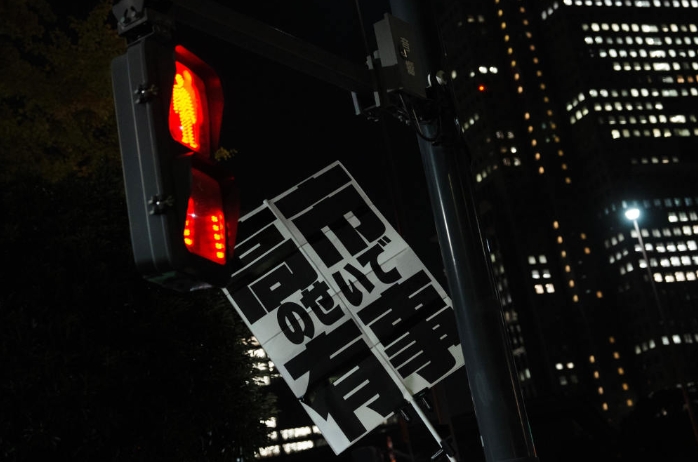 11月21日,在日本東京的首相官邸外,民眾舉起標語參加抗議活動。新華社記者 賈浩成 攝