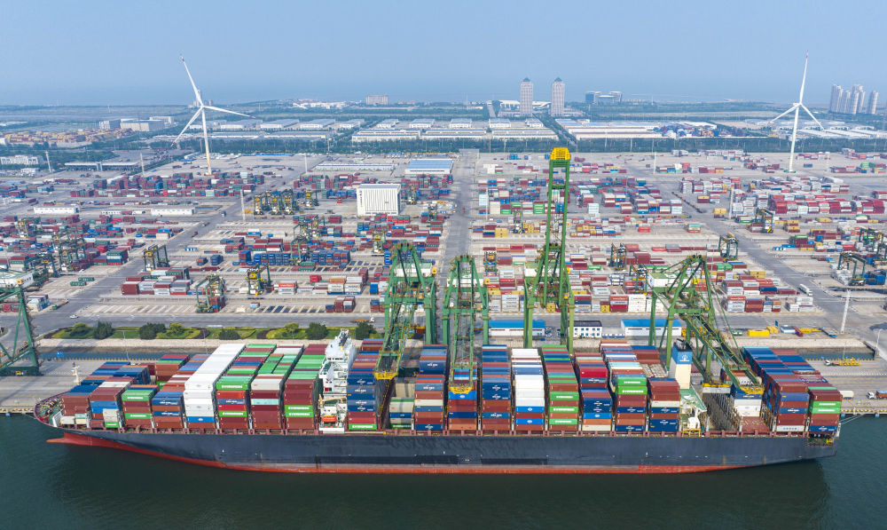 7月3日,一艘集裝箱貨輪??吭谔旖蚋厶窖髧H集裝箱碼頭(無人機(jī)照片)。新華社記者 趙子碩 攝