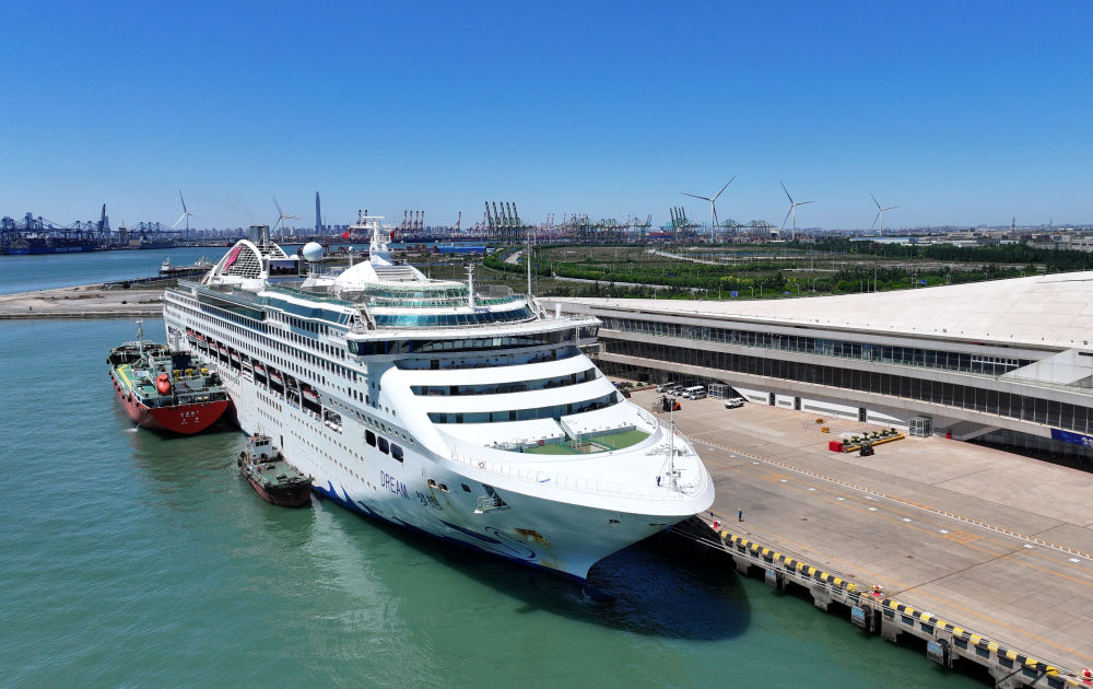 5月15日,“夢想”號郵輪??吭谔旖驀H郵輪母港(無人機(jī)照片)。新華社記者 趙子碩 攝