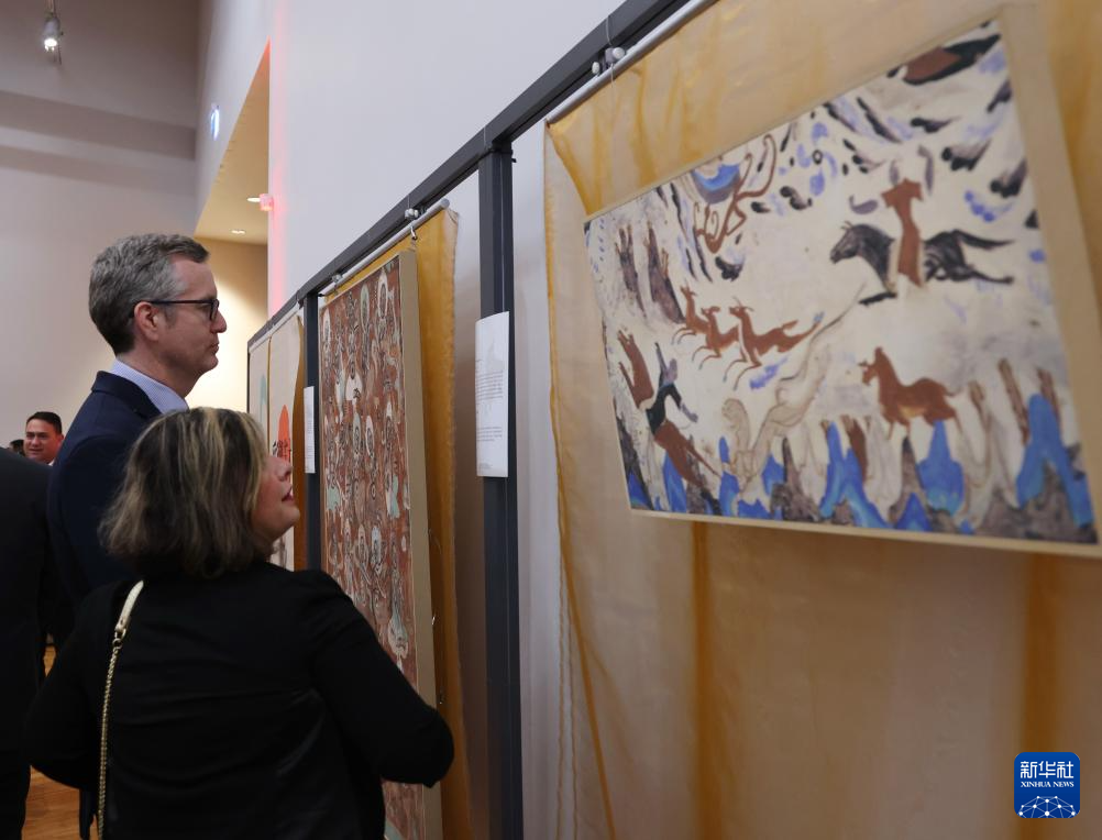 9月26日晚,在新西蘭首都惠靈頓舉行的中國駐新西蘭大使館國慶招待會上,嘉賓們駐足觀看敦煌文化展。新華社發(fā)(孟韜攝)