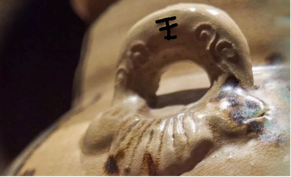 青釉褐綠點(diǎn)彩云紋雙耳罐的罐身印有“王”的字樣。圖片來(lái)源:揚(yáng)州日?qǐng)?bào)社