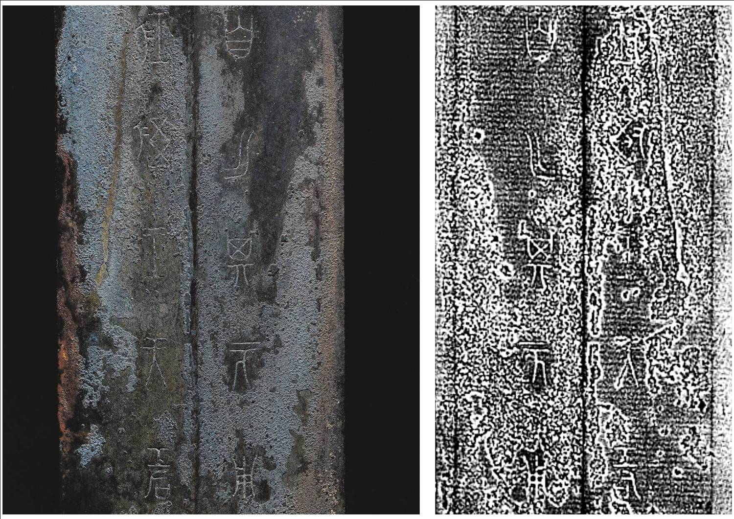 這把青銅劍通長(zhǎng)58.3厘米,劍身寬大厚重,在前部有一個(gè)明顯變窄,可以提高劍的刺穿能力,劍尖雖然只有極尖銳的一點(diǎn),但不可思議的是,在高倍放大鏡下仍然可以看出有六至八個(gè)截面。劍身雖然光素,仔細(xì)觀察會(huì)發(fā)現(xiàn)寶劍通體泛著幽幽的神秘藍(lán)光,劍格上鑄出獸面紋,鑲嵌的綠松石有一面已經(jīng)脫落,劍身近格處鑄有兩行銘文:“攻敔(吳)王夫差自乍(作)其元用”,表明這把劍的擁有者是吳國(guó)歷史上大名鼎鼎的吳王夫差。