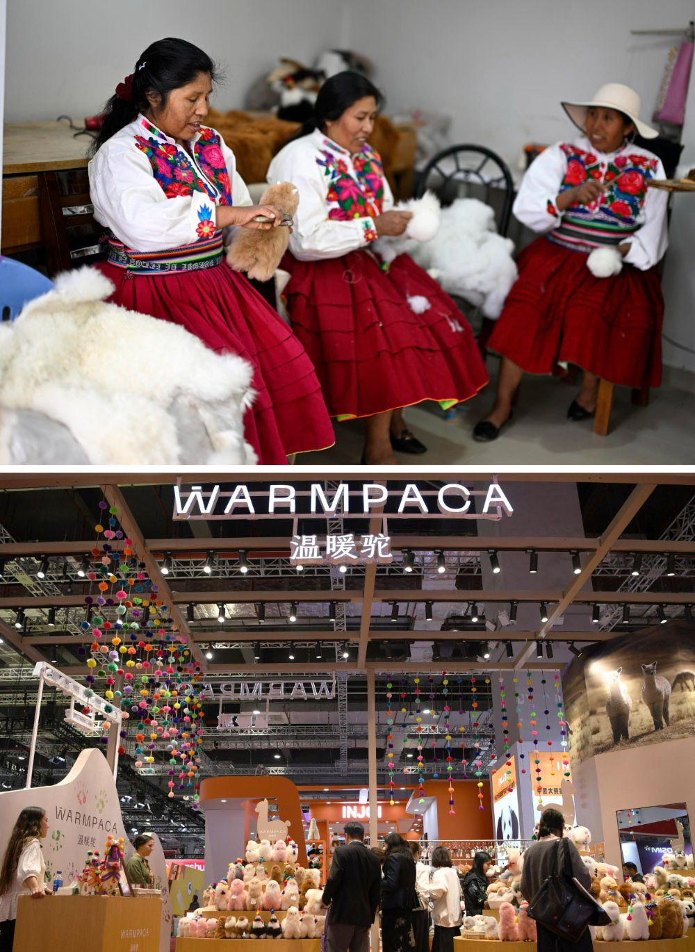 2016年,中國姑娘馬玉霞在秘魯阿雷基帕街邊市場購買了秘魯羊駝毛制品手工藝人奧斯瓦爾多·馬馬尼的羊駝毛玩偶并引入中國市場。通過連續(xù)參展進(jìn)博會,羊駝毛制品在中國市場大受歡迎,并創(chuàng)立了中文品牌“溫暖駝”。今年,秘魯品牌“溫暖駝”連續(xù)第七年亮相進(jìn)博會,受到更多中國消費(fèi)者的喜愛。目前,“溫暖駝”品牌已入駐國內(nèi)30多家商場,并且開拓了電商平臺線上銷售,年銷量超過3萬只。上圖:2024年6月20日,在秘魯阿雷基帕,工作人員在羊駝毛制品手工藝人奧斯瓦爾多·馬馬尼的工坊制作羊駝玩偶。下圖:2024年11月5日在上海拍攝的第七屆進(jìn)博會秘魯“溫暖駝”展臺。