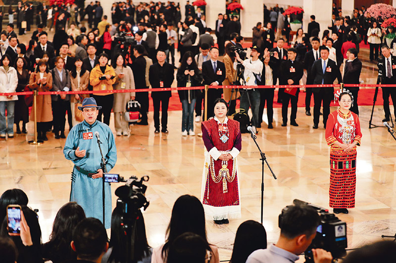 2025年3月10日,全國政協(xié)十四屆三次會議第三場“委員通道”在人民大會堂舉行。圖為少數民族委員亮相“委員通道”。 民族畫報記者 康夢婷/攝