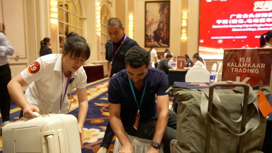 最早,當(dāng)?shù)刈龅氖遣剂喟?,用服裝廠的邊角料拼的。如今,產(chǎn)品已從最初的手提包、布袋,升級(jí)為拉桿箱、背包等。有的帶水杯架,甚至還能自己稱重、有充電USB接口……