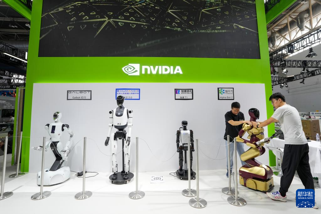 7月14日,在第三屆中國國際供應鏈促進博覽會數(shù)字科技鏈展區(qū)英偉達公司展位,工作人員在布置展品。