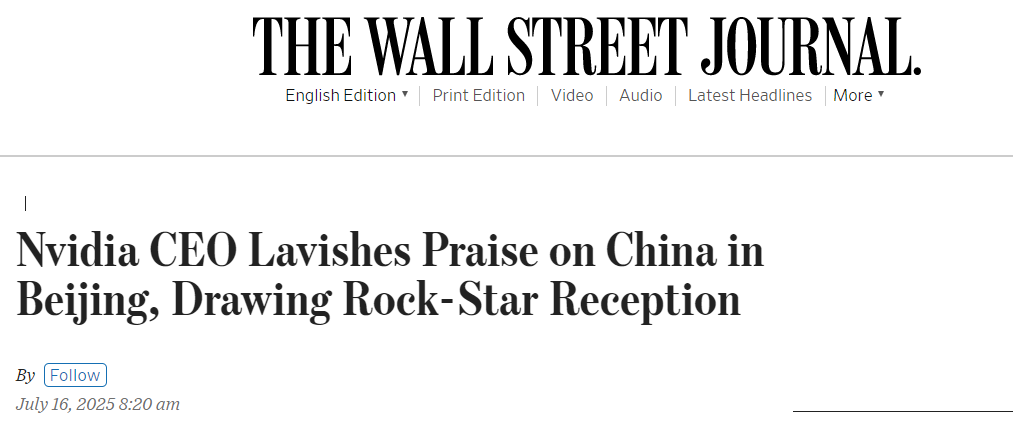 美國《華爾街日報》報道稱,市值達4萬億美元的AI芯片公司掌門人黃仁勛在訪問北京期間多次表達對中國的贊賞,盛贊中國的科技進步。