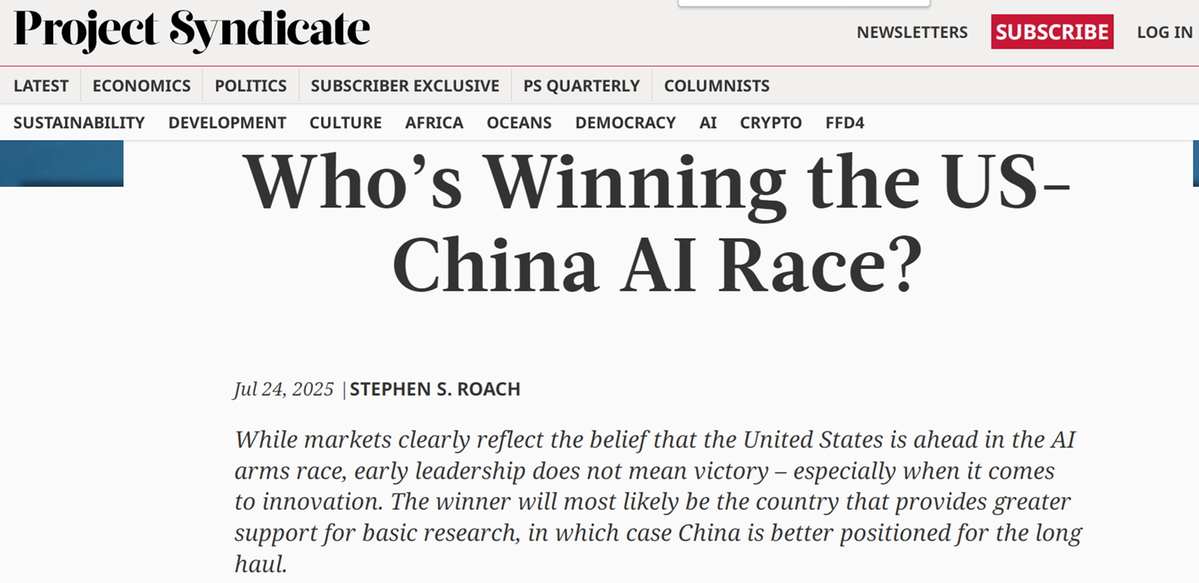 美國摩根士丹利亞洲區(qū)前主席斯蒂芬·羅奇在報業(yè)辛迪加網(wǎng)站(Project Syndicate)發(fā)表文章指出,全球人工智能(AI)競賽的勝負取決于基礎研究的投入,而非短期市場表現(xiàn)。羅奇認為,中國憑借產(chǎn)業(yè)生態(tài)、研發(fā)投入和文化傳統(tǒng),使其在長期競爭中占據(jù)優(yōu)勢。