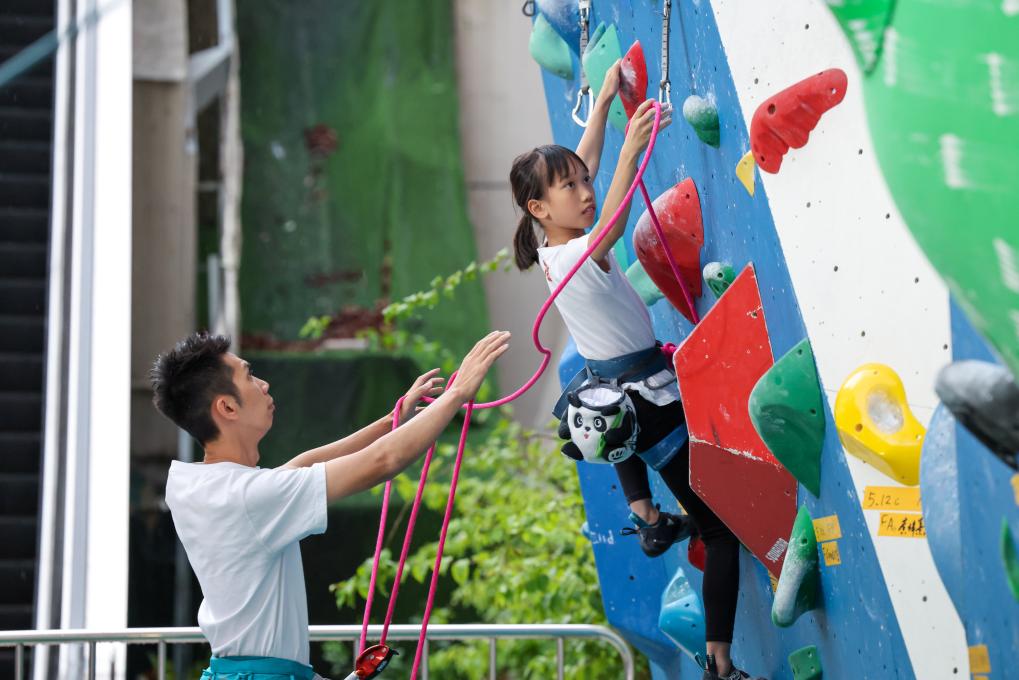 圖為在深圳福田區(qū)呢度有家攀巖館,來(lái)自中國(guó)香港的9歲女孩何芊芊(右)在爸爸何善揮的保護(hù)下開(kāi)始難度攀巖訓(xùn)練(6月17日攝)。新華社記者 梁旭 攝