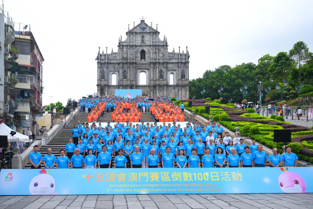 這是8月1日在澳門拍攝的第十五屆全國(guó)運(yùn)動(dòng)會(huì)倒計(jì)時(shí)100天慶?;顒?dòng)現(xiàn)場(chǎng)。新華社發(fā)(張金加攝)