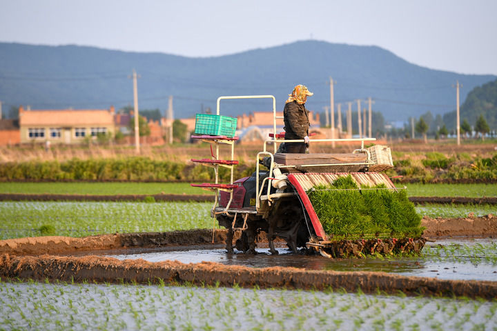 在吉林省吉林市永吉縣鑫豐種植農(nóng)民專業(yè)合作社,農(nóng)民駕駛農(nóng)機進行水稻插秧(2025年5月26日攝)。新華社記者 張楠 攝