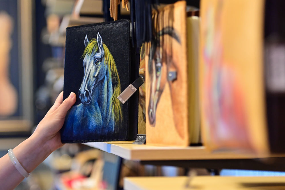 “伊犁是‘天馬之鄉(xiāng)’,我們在皮毛一體的馬皮上進(jìn)行手工繪畫,每幅圖案都是獨(dú)一無二的,讓非遺與旅游深度融合。”店長茹柯耶·艾散介紹,店鋪還開發(fā)出馬毛筆記本、首飾等文創(chuàng)衍生品,深受年輕人喜愛。