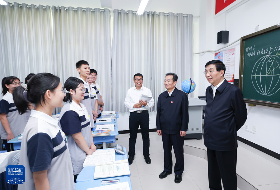 9月25日下午,受習近平總書記囑托,中共中央政治局常委、全國政協(xié)主席、中央代表團團長王滬寧帶領中央代表團部分成員在巴音郭楞蒙古自治州庫爾勒市看望慰問當?shù)馗髯甯刹咳罕姟_@是王滬寧和中央代表團部分成員在庫爾勒市第二十三中學考察教育援疆情況。新華社記者 姚大偉 攝