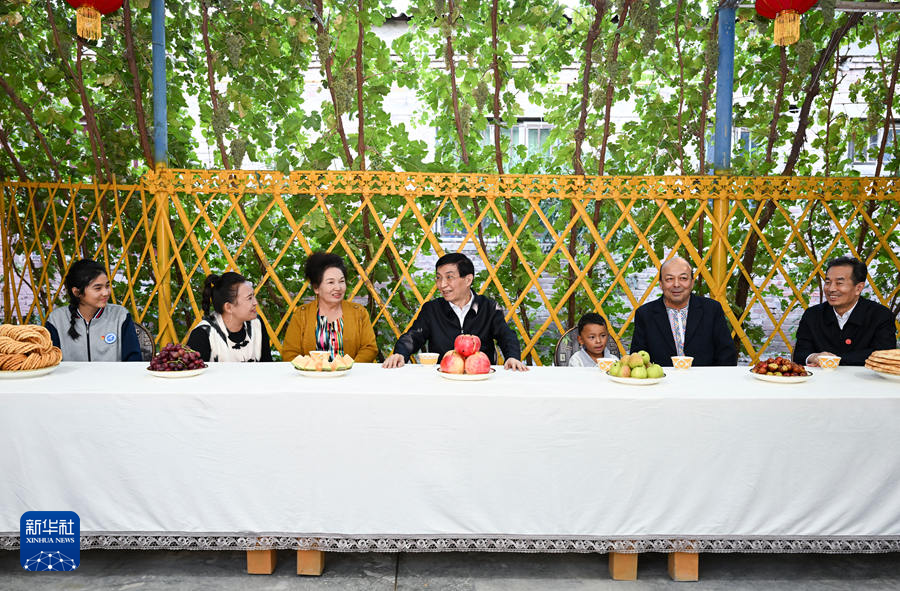 9月25日下午,受習近平總書記囑托,中共中央政治局常委、全國政協(xié)主席、中央代表團團長王滬寧帶領中央代表團部分成員在巴音郭楞蒙古自治州庫爾勒市看望慰問當?shù)馗髯甯刹咳罕?。這是王滬寧和中央代表團部分成員在庫爾勒市阿瓦提鄉(xiāng)吾夏克鐵熱克村了解鄉(xiāng)村產業(yè)發(fā)展和群眾生產生活情況。新華社記者 張領 攝
