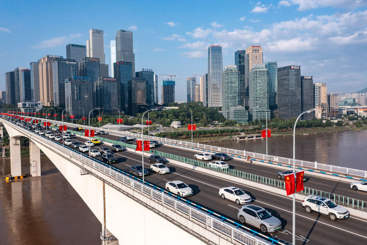 2025年10月1日,車輛行駛在掛滿國(guó)旗的重慶黃花園嘉陵江大橋上(無(wú)人機(jī)照片)。新華社記者 黃偉 攝
