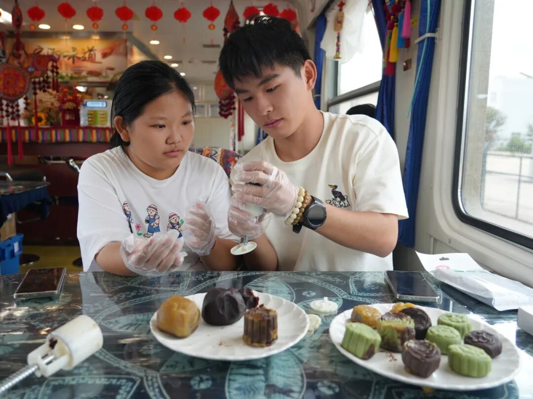 除了歌舞與燈謎,列車工作人員還精心準(zhǔn)備了互動(dòng)體驗(yàn)環(huán)節(jié)。旅客圍坐在一起,親手制作月餅、拼裝手工燈籠。工作人員還為參與活動(dòng)的旅客送上書簽,大家提筆寫下對(duì)家人的中秋祝愿,字里行間滿是牽掛與祝福?;顒?dòng)尾聲,身著漢服的列車工作人員端來一盤香甜的滇式月餅,邀請(qǐng)旅客品嘗。