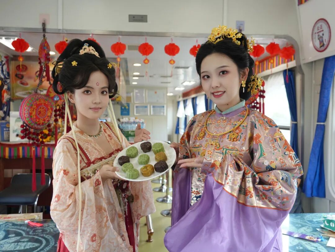 “旅客朋友們,歡迎乘坐本趟列車,中秋佳節(jié)將至,我們?cè)?號(hào)餐車準(zhǔn)備了特色活動(dòng),誠(chéng)邀大家共慶佳節(jié)!”列車長(zhǎng)李文雯的聲音通過廣播傳遍車廂。隨即《納西三部曲》旋律響起——身著絢麗民族服飾的列車員們,拉著周圍旅客一同跳起納西族舞蹈,歡快的節(jié)奏瞬間點(diǎn)燃車廂氣氛。